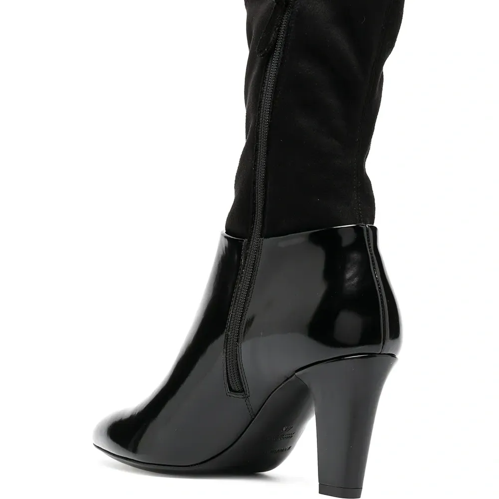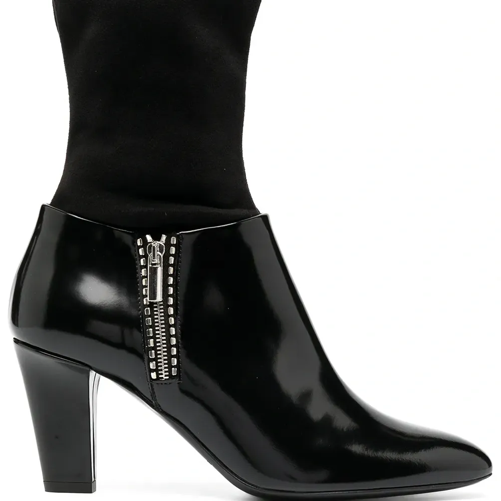 Носочная деталь, заостренный носок, короткая застежка на молнии сбоку, застежка на молнии сбоку, стелька с логотипом и высокий блочный каблук. Цвет: черный.