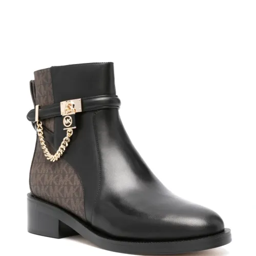Черный, серо-коричневый, телячья кожа, узор с изображением монограммы, золотистая фурнитура, цепочка, петля для подтягивания сзади, закругленный носок, застежки на молнии сбоку и блочный каблук средней высоты.