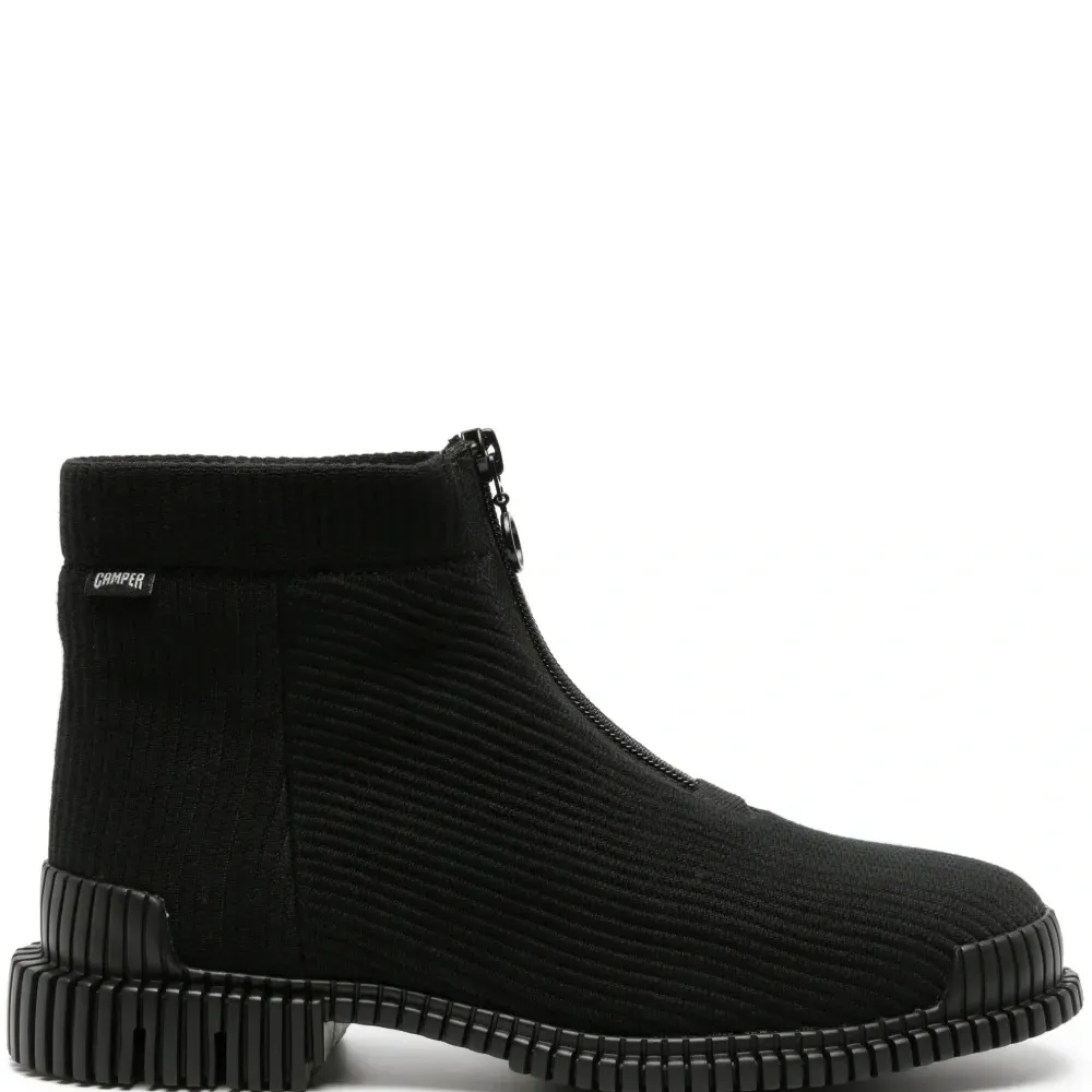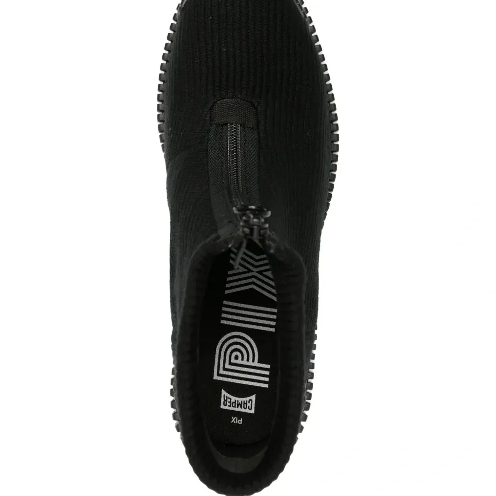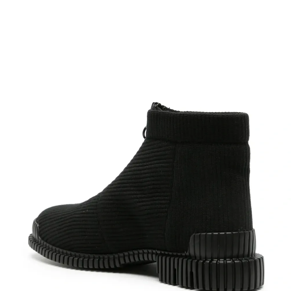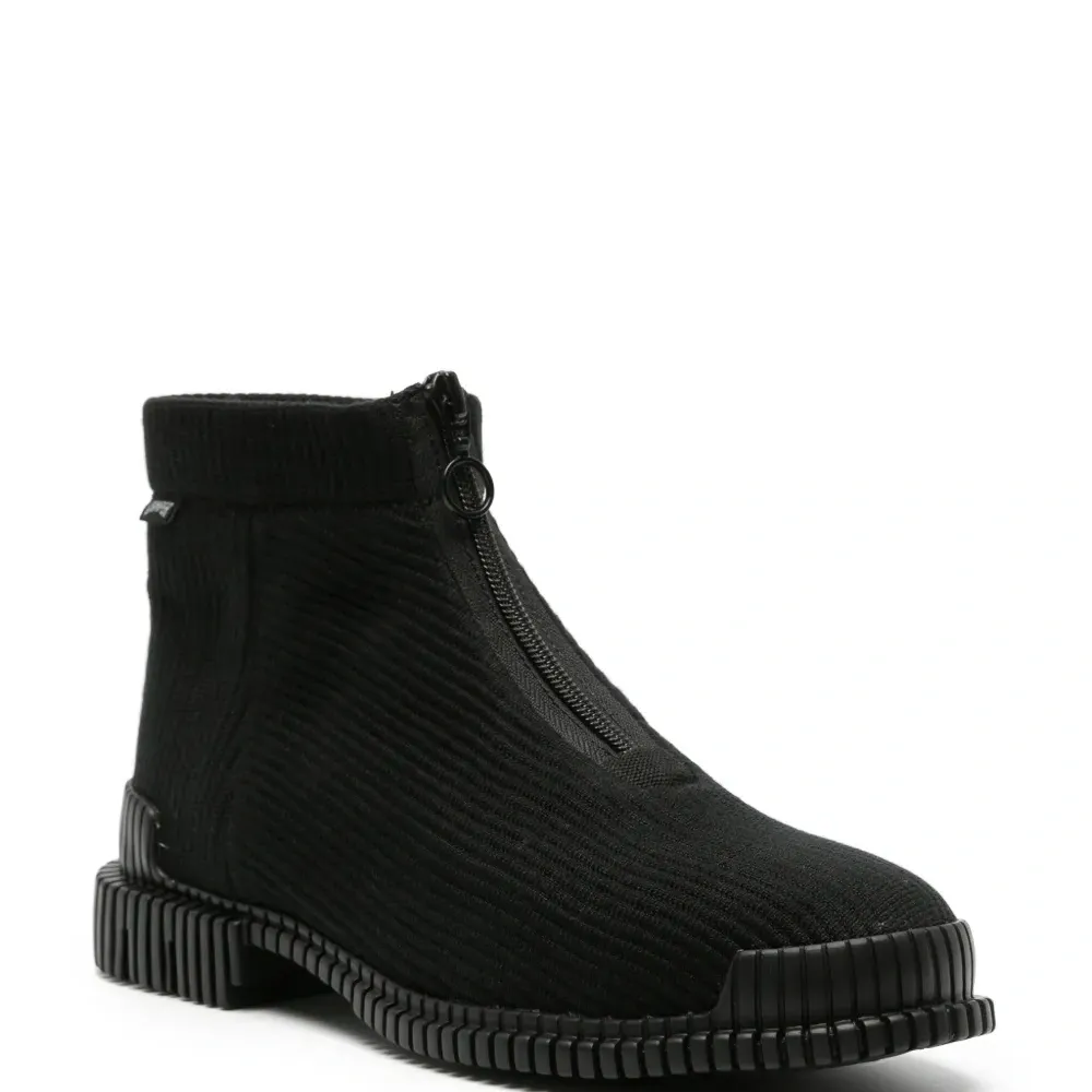 Черный, трикотажный материал, строчка в тон, детали в рубчик, маленькая подвеска с логотипом, застежка на молнии спереди, миндалевидный носок, высота по щиколотку, съемная стелька, стелька с логотипом, логотип на подошве и резиновая подошва.