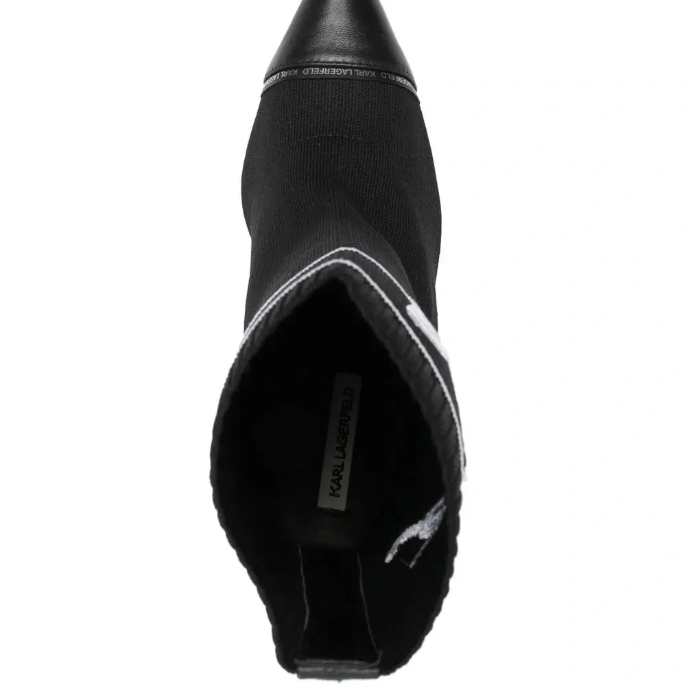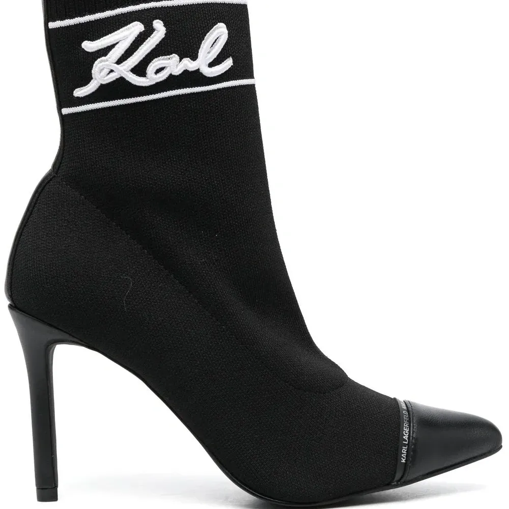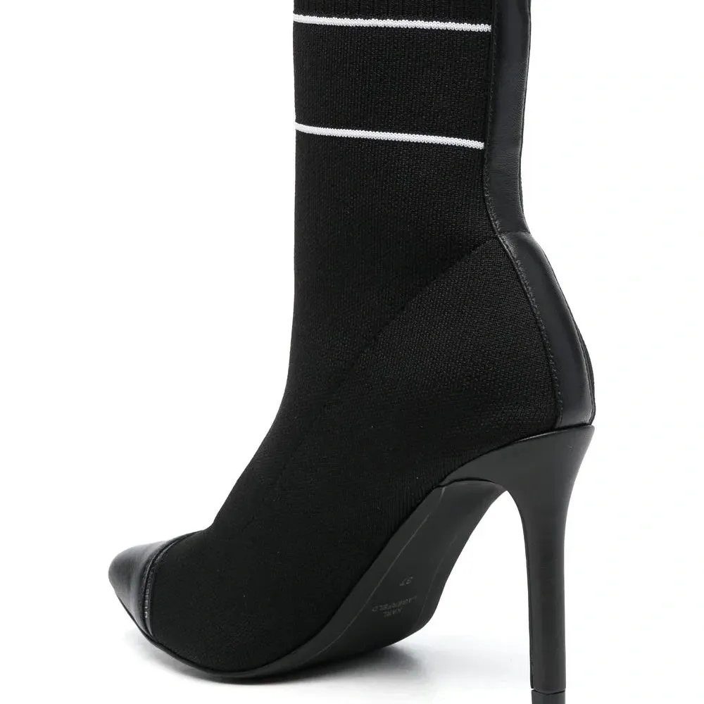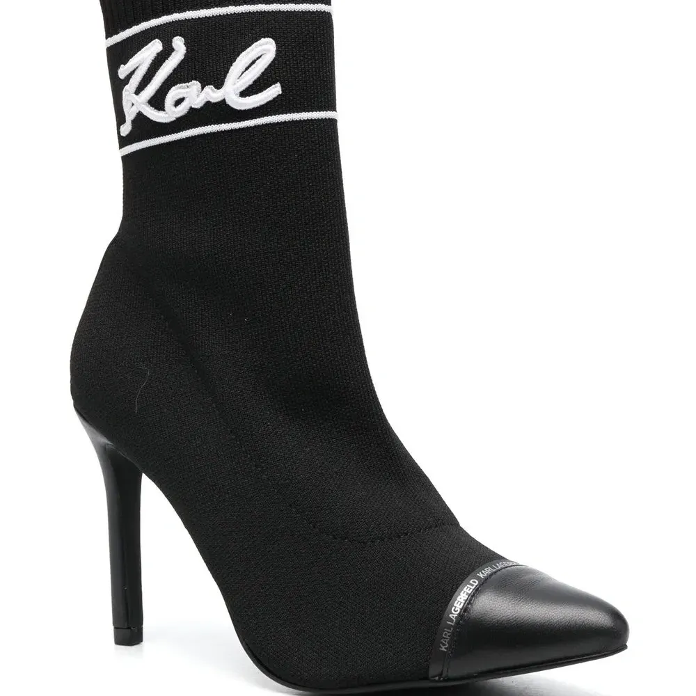 Черный/белый, носочная деталь, логотип в технике интарсия, логотип спереди, контрастный носок, заостренный носок, модель без застежки, высота по щиколотку, каблук на высокой шпильке и стелька с логотипом.