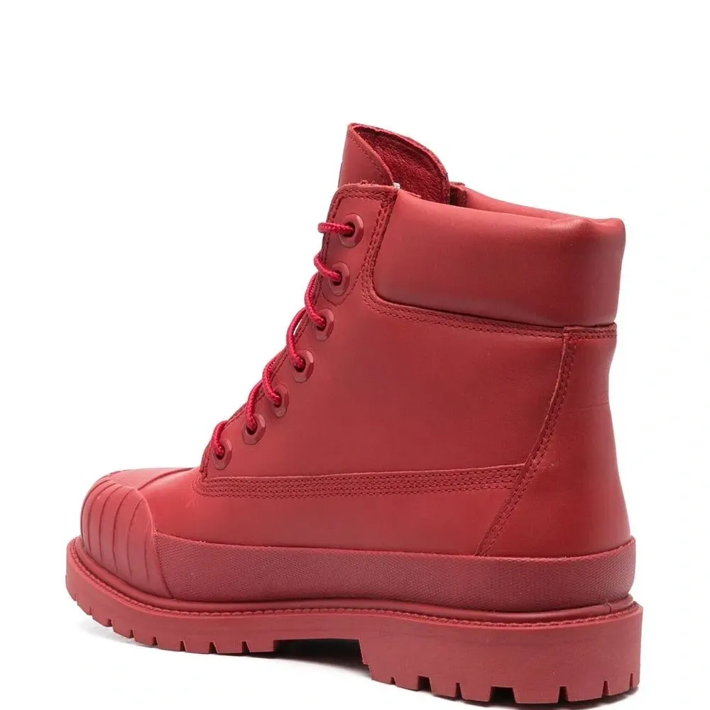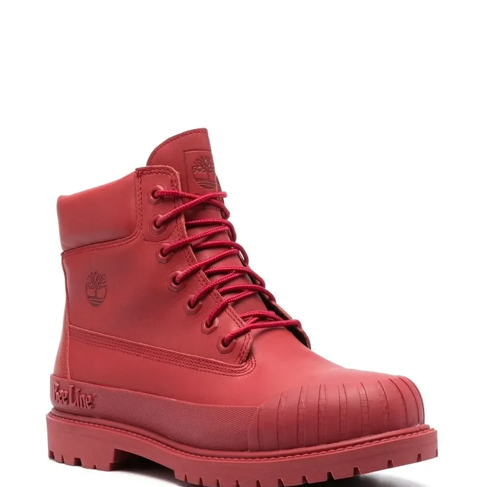 Красный, телячья кожа, тисненый логотип сбоку, тисненый логотип сбоку, закругленный носок, шнуровка спереди, стелька с логотипом, светло-коричневая резиновая подошва и рифленая резиновая подошва.
