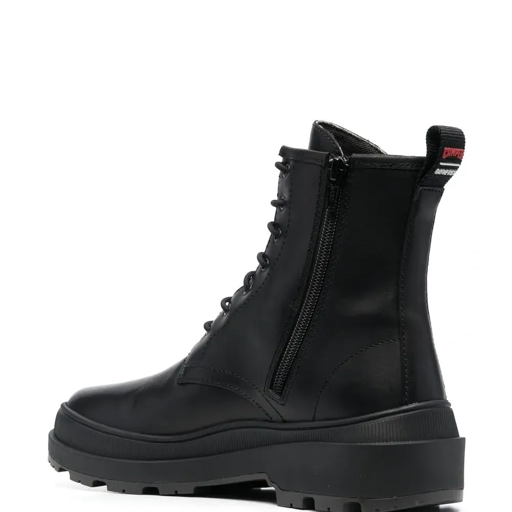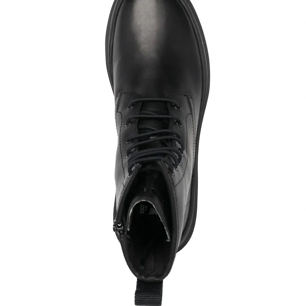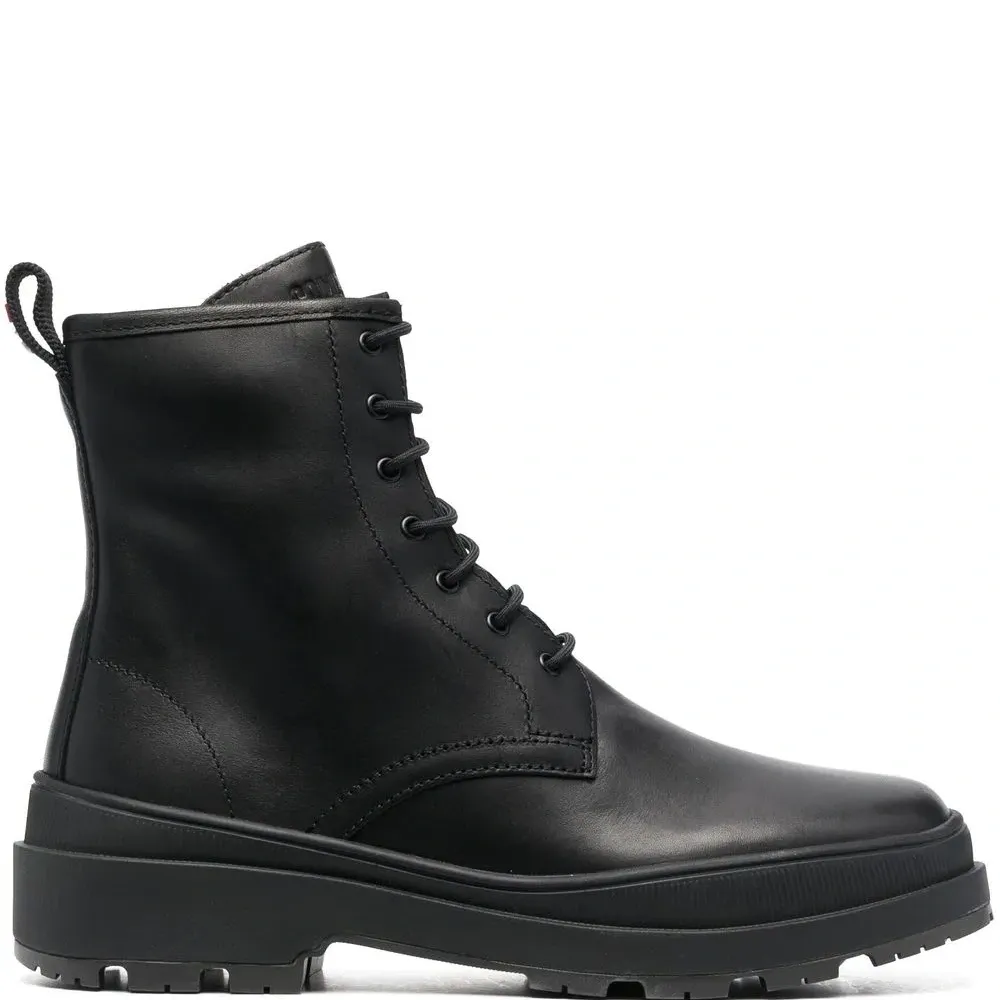 Черный, телячья кожа, закругленный носок, шнуровка спереди, петля для подтягивания сзади и рифленая резиновая подошва.