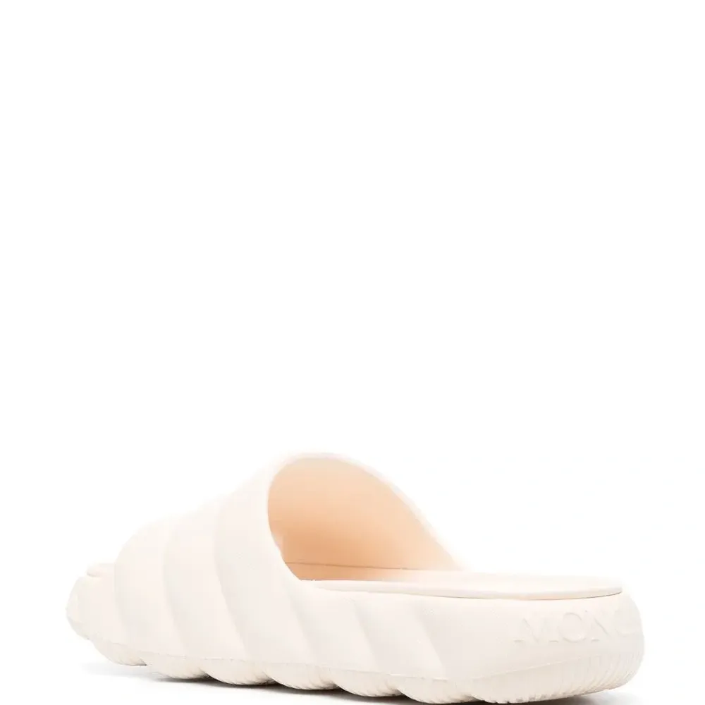 Бежевый, открытый носок и плоская подошва.