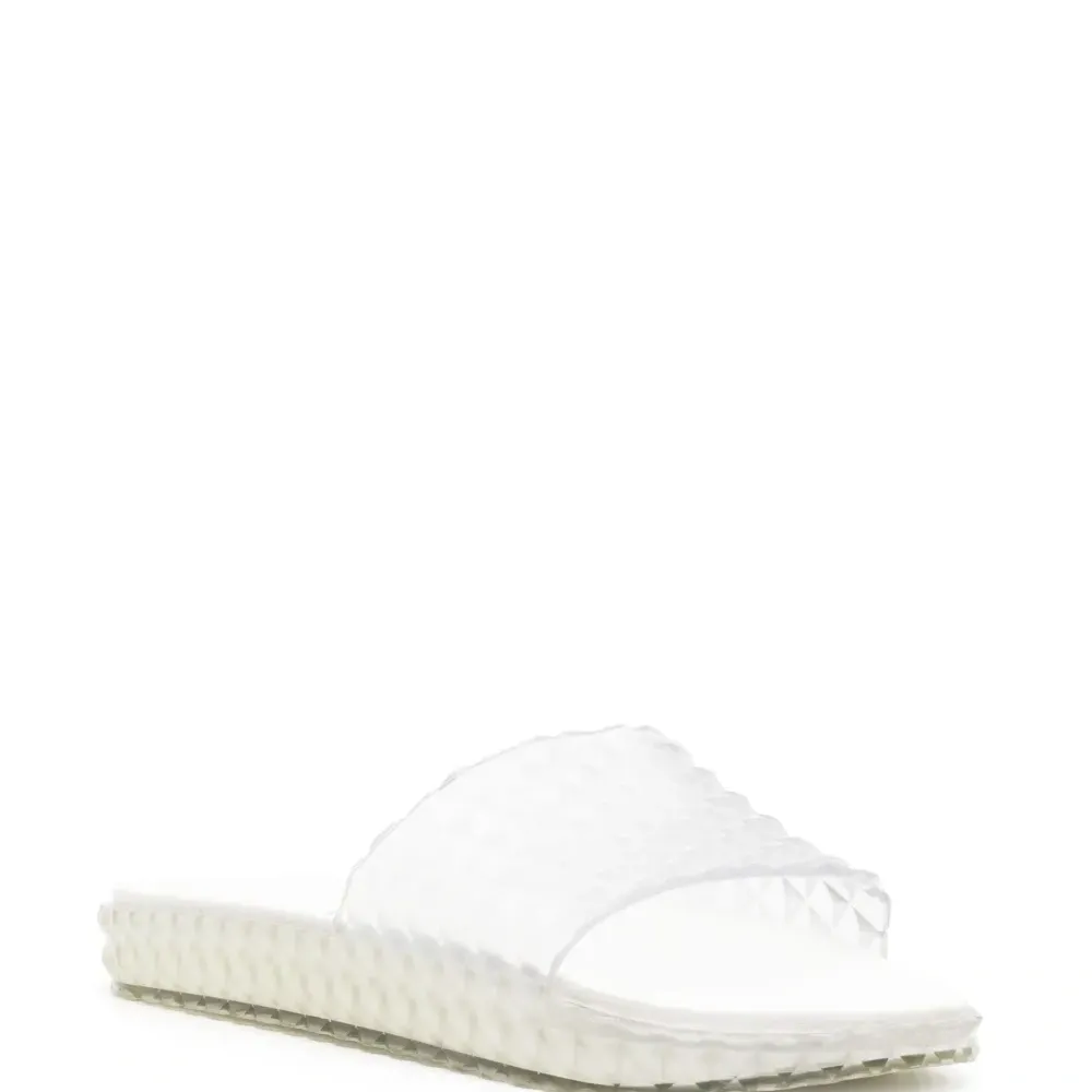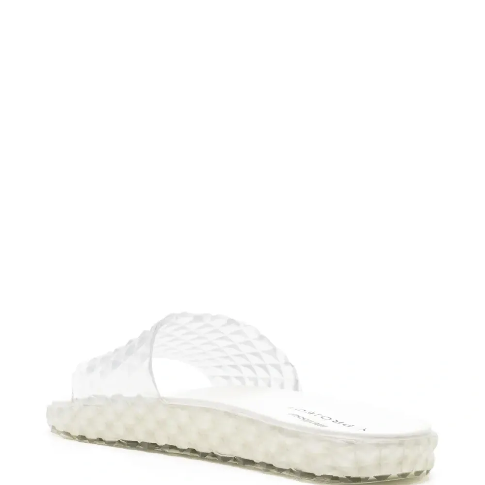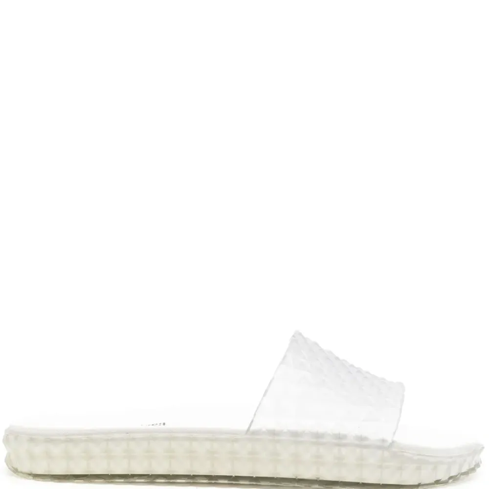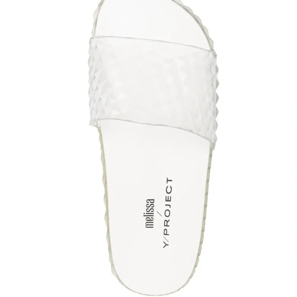 Молочно-белый, кремово-белый, объемная аппликация, прозрачный материал, ремешок на палец, формованная стелька, стелька с логотипом, миндалевидный носок, открытый носок, модель без застежки и плоская резиновая подошва.