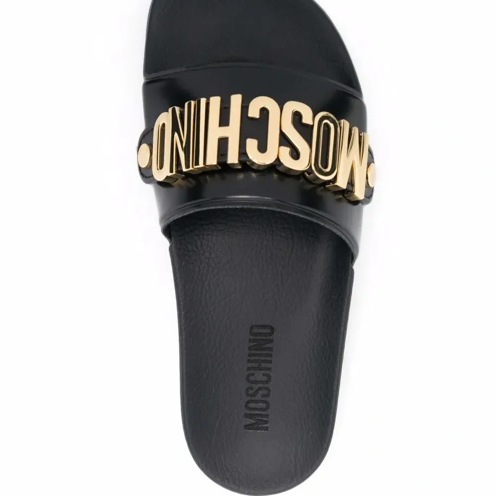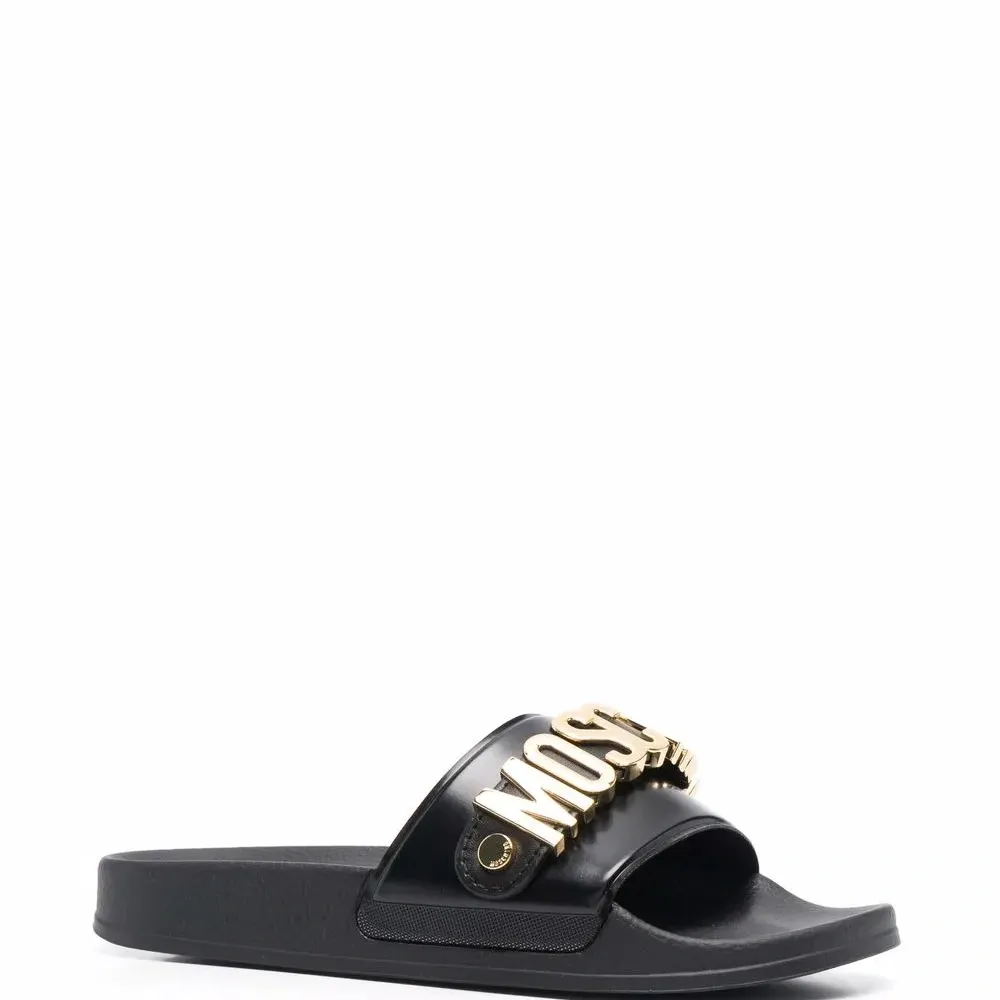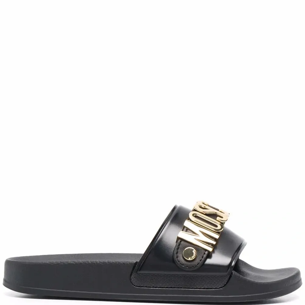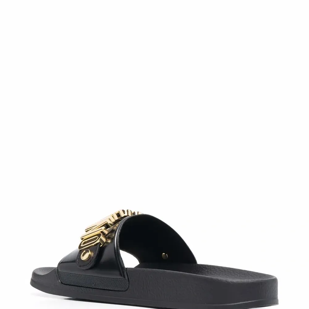 Золотистый логотип, открытый носок, модель без застежки и массивная резиновая подошва. Цвет: черный.