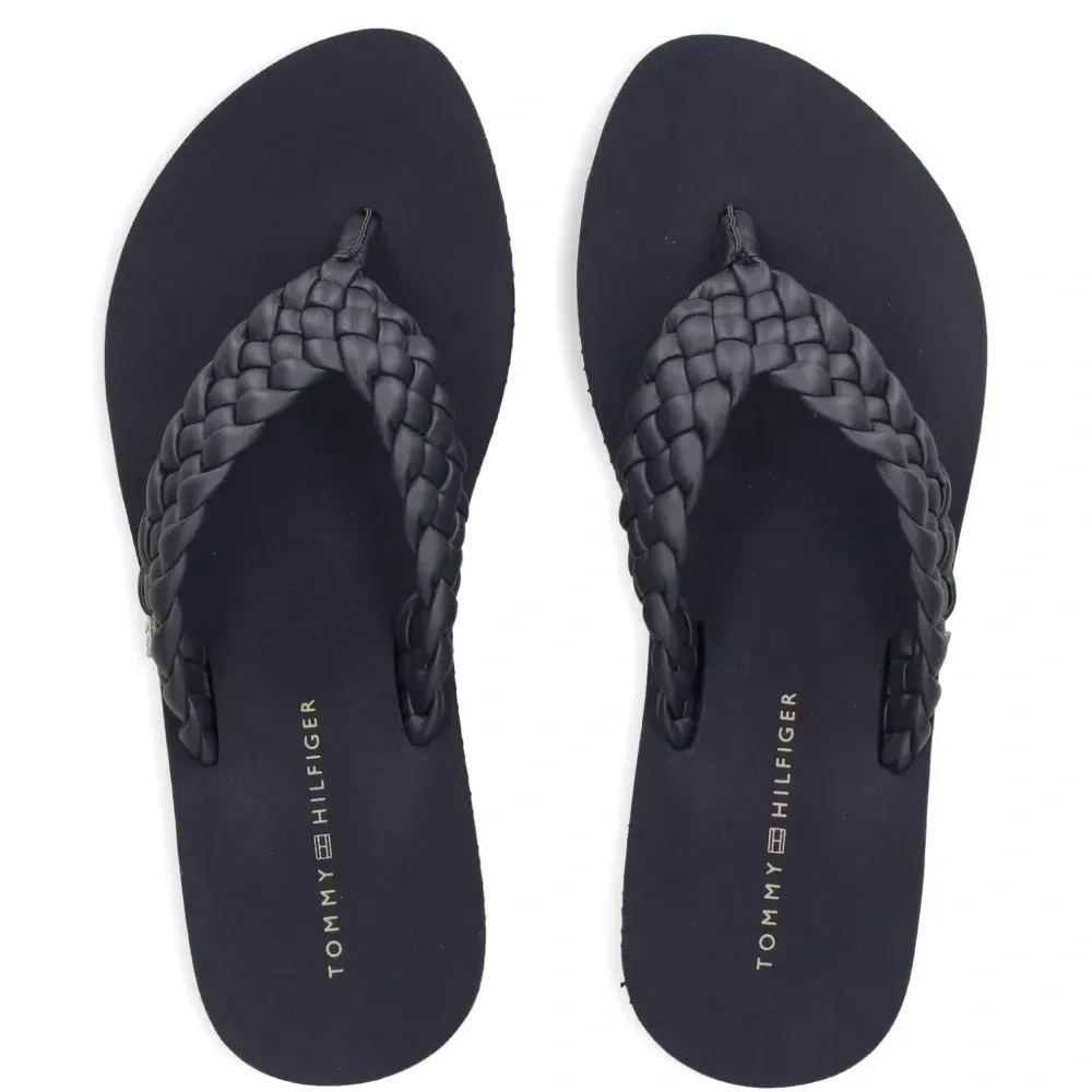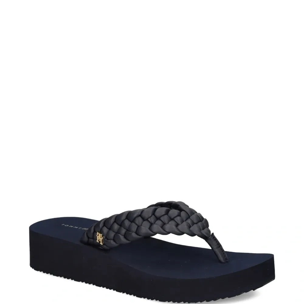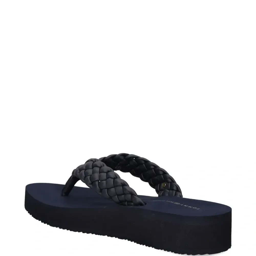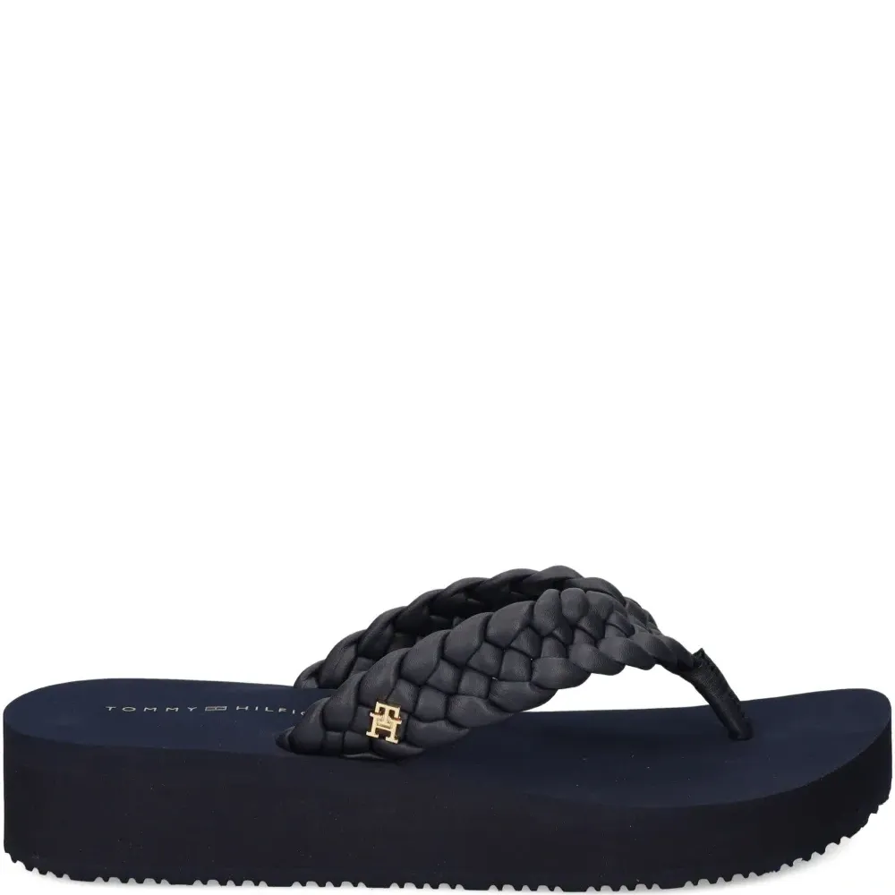 синий плетёный ремешок, подошва-платформа, золотистая деталь с логотипом