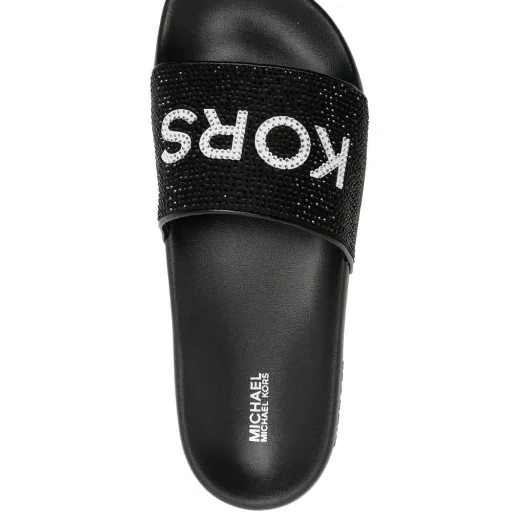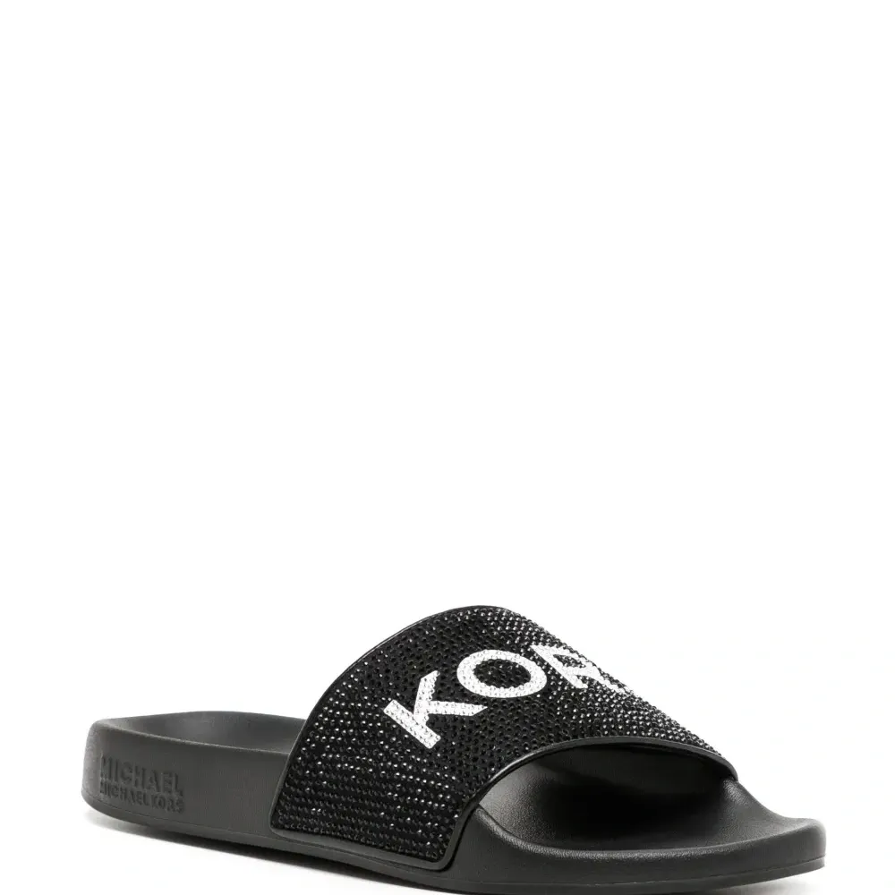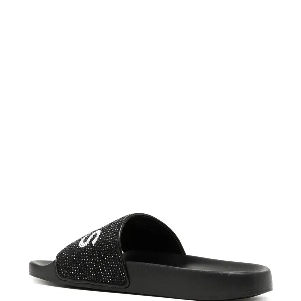 Черный, логотип спереди, украшения из горного хрусталя, открытый носок, миндалевидный носок, модель без застежки, логотип на стельке и плоская резиновая подошва.