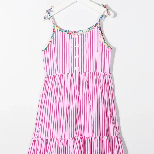 Узор в вертикальную полоску, контрастная отделка, многоярусная юбка, круглый вырез, короткая застежка на пуговицах спереди и без рукавов.