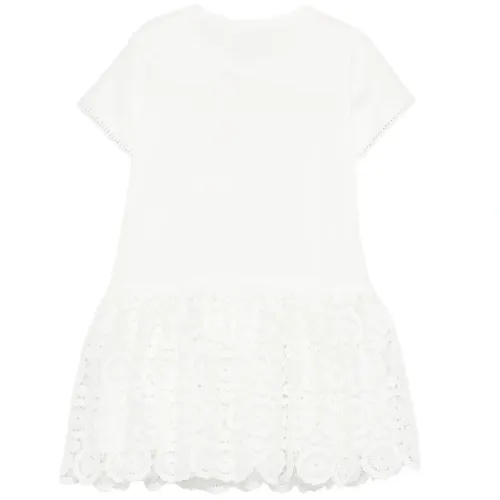 белый кружевной декор, короткие рукава, аппликация, круглый вырез, длина выше колена