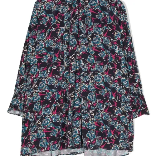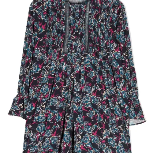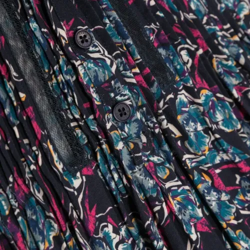 Темно-синий, сплошной цветочный принт, складки, кружевная отделка, круглый вырез, короткая застежка на пуговицах спереди, длинные рукава, расклешенные манжеты, расклешенная юбка и прямой подол.