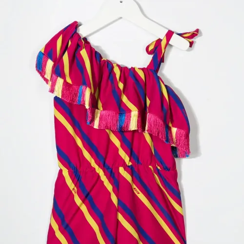 Модель на одном плече, узор в диагональную полоску, вставки с оборками и прямой подол. Цвет: разноцветный.