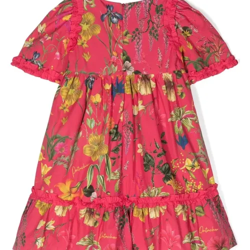 Сплошной цветочный принт, круглый вырез, короткие рукава и расклешенный подол.