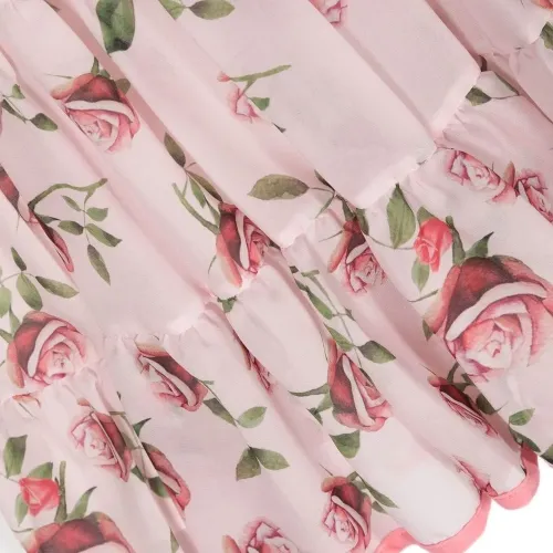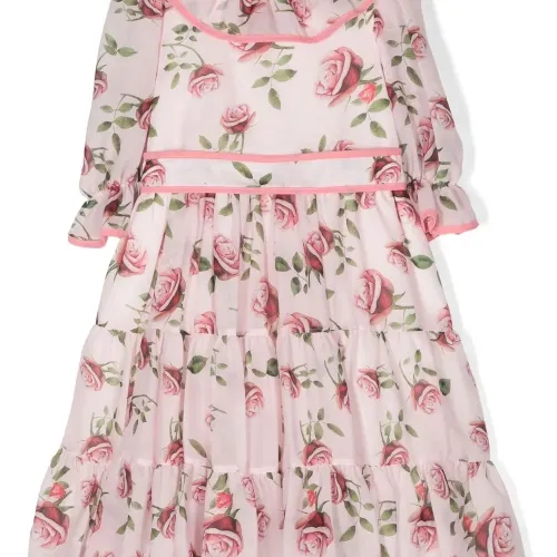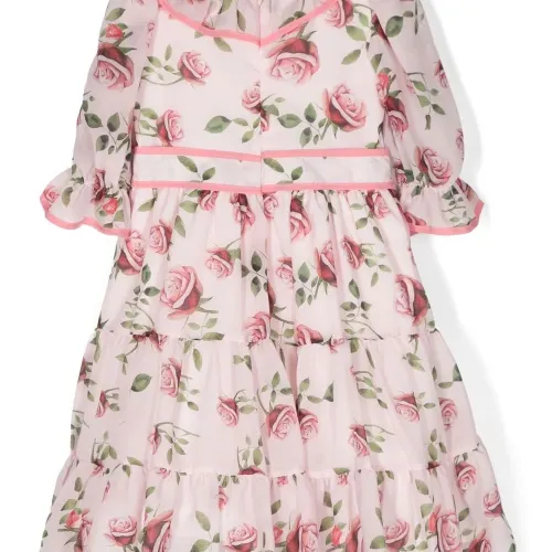 Розовый, сплошной цветочный принт, круглый вырез, рукава по локоть и расклешенный подол.