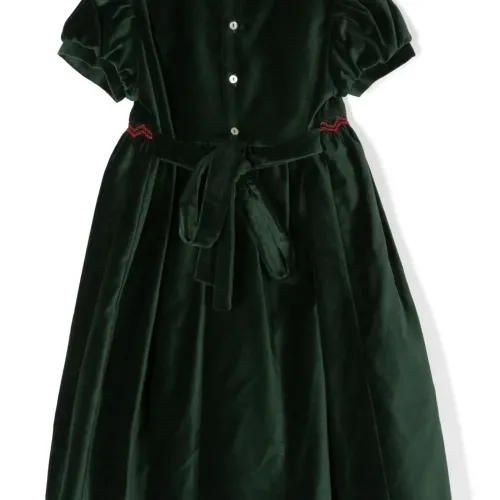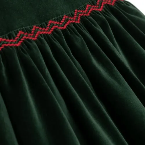 Темно-зеленый, хлопок, бархатный эффект, вышивка в горизонтальную полоску, воротник Питер Пэн, короткие рукава, эластичные манжеты, застежка на пуговицы сзади, завязка на бант сзади, юбка А-образного силуэта и прямой подол.