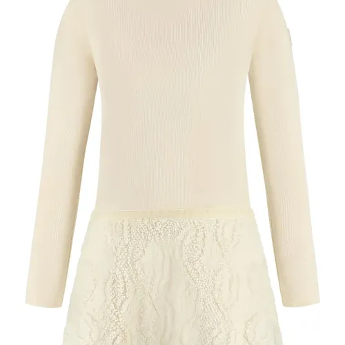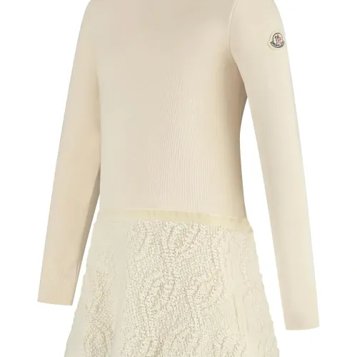 кремовая фактурная юбка, круглый вырез, длинные рукава, ребристая отделка, нашивка с логотипом