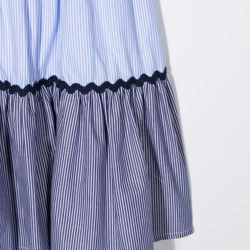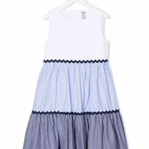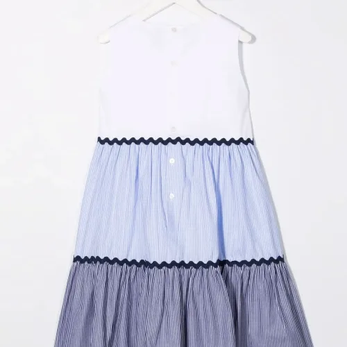 Дизайн колор-блок, узор в вертикальную полоску, круглый вырез, без рукавов, застежка на пуговицы сзади и расклешенный крой.
