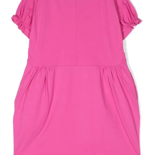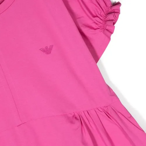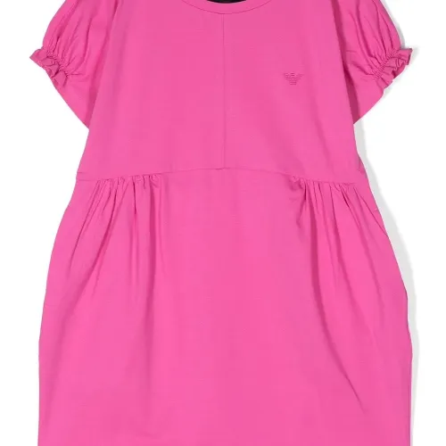 Фуксия, эластичный хлопок, ткань джерси, детали с оборками, вышитый логотип, круглый вырез, короткие рукава и прямой подол.
