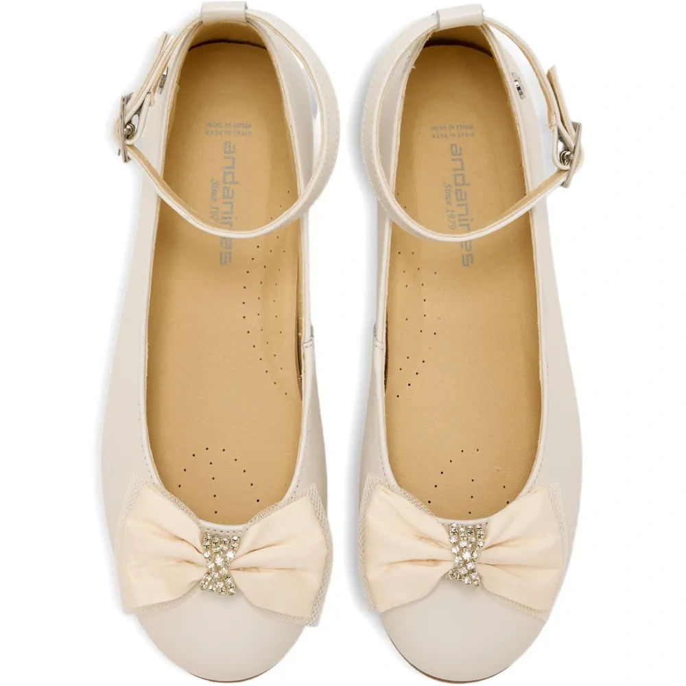 кремовые туфли с бантом, украшением из кристаллов, пряжкой на ремешке вокруг щиколотки, круглым мысом и плоской подошвой