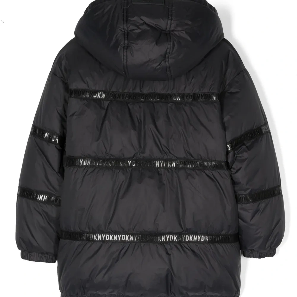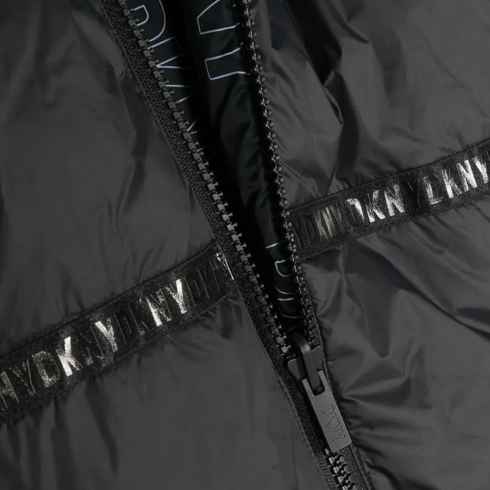 Черный, водоотталкивающий материал, двусторонний дизайн, сплошной принт с логотипом, дутый материал, классический капюшон, длинные рукава, застежка на молнии спереди, два боковых кармана с листочкой, эластичные манжеты и эластичный подол.