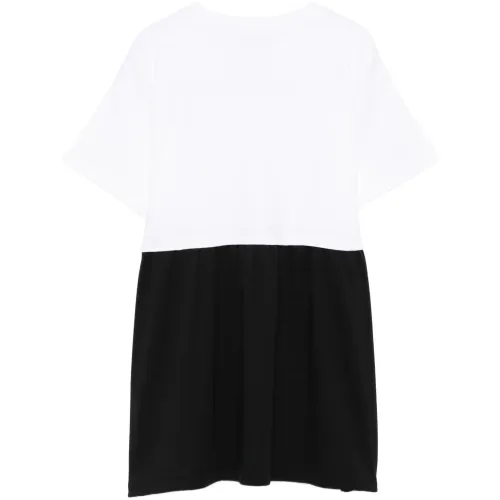 белое и чёрное платье с аппликацией в виде медведя, круглым вырезом, короткими рукавами и плиссированной юбкой