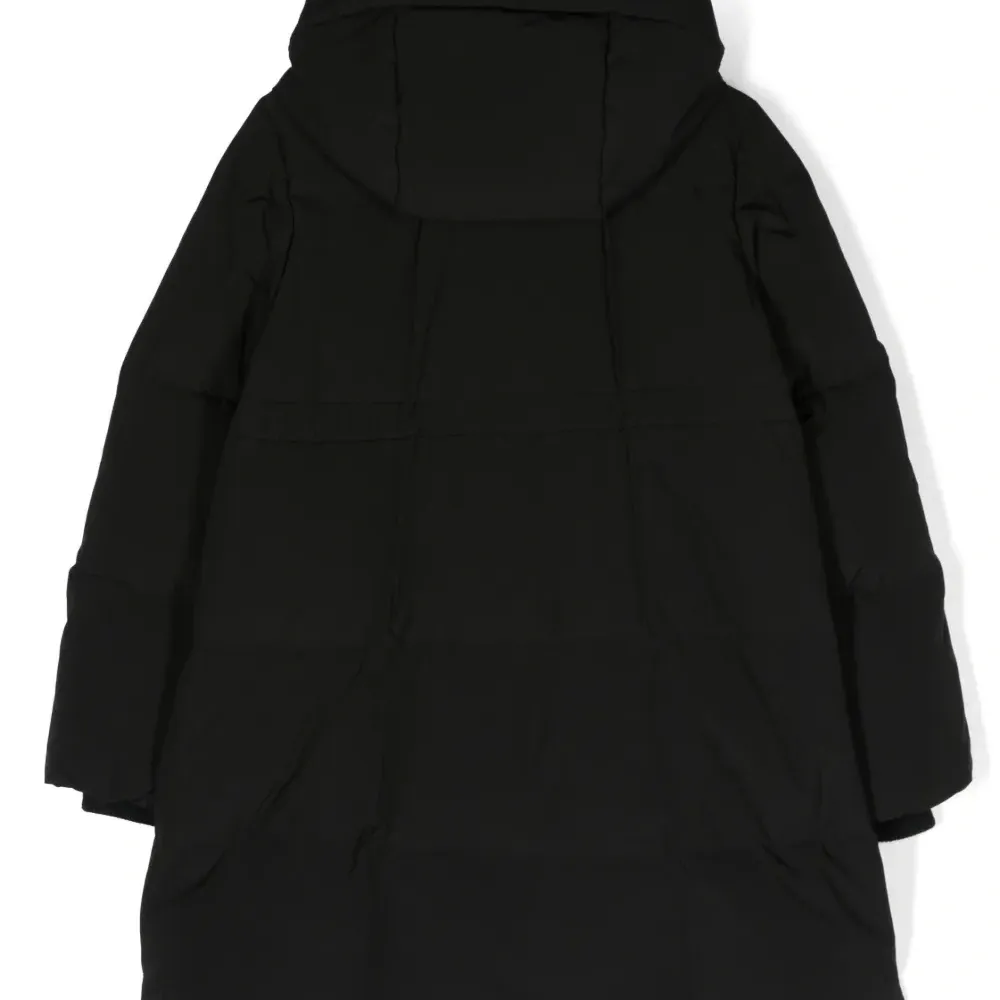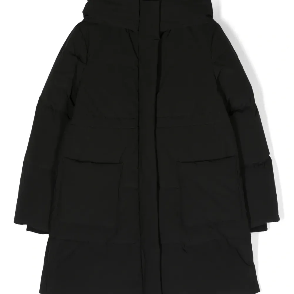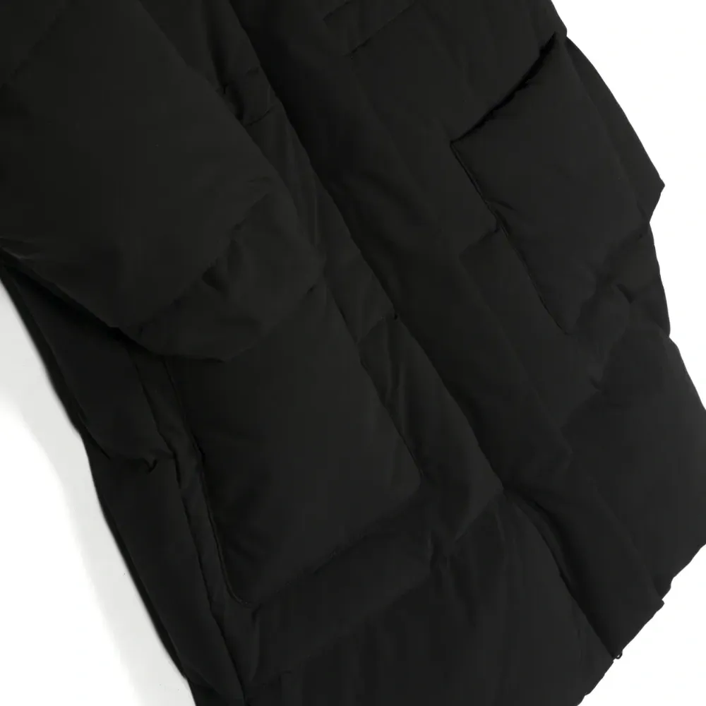 Черный, гусиный пух, дутый материал, вышитый логотип на рукаве, высокий воротник, потайная застежка спереди, классический капюшон, два накладных кармана спереди и прямой подол.