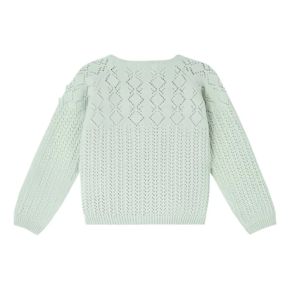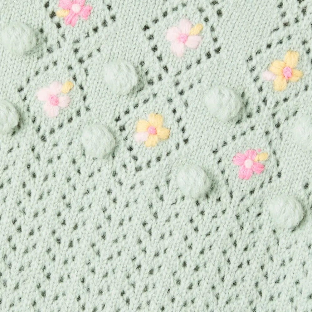 зеленый джемпер с вышивкой, открытой вязкой, круглым вырезом и длинными рукавами