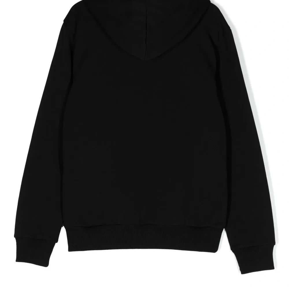 Черный, хлопок, принт с логотипом, классический капюшон, карман-муфта, длинные рукава и подол в рубчик.