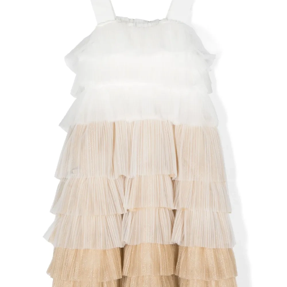 Белый, золотистый, покрытие с эффектом металлик, градиентный эффект, модель с оборками, полупрозрачный верхний слой, без рукавов и два ремня на плечо с логотипом.