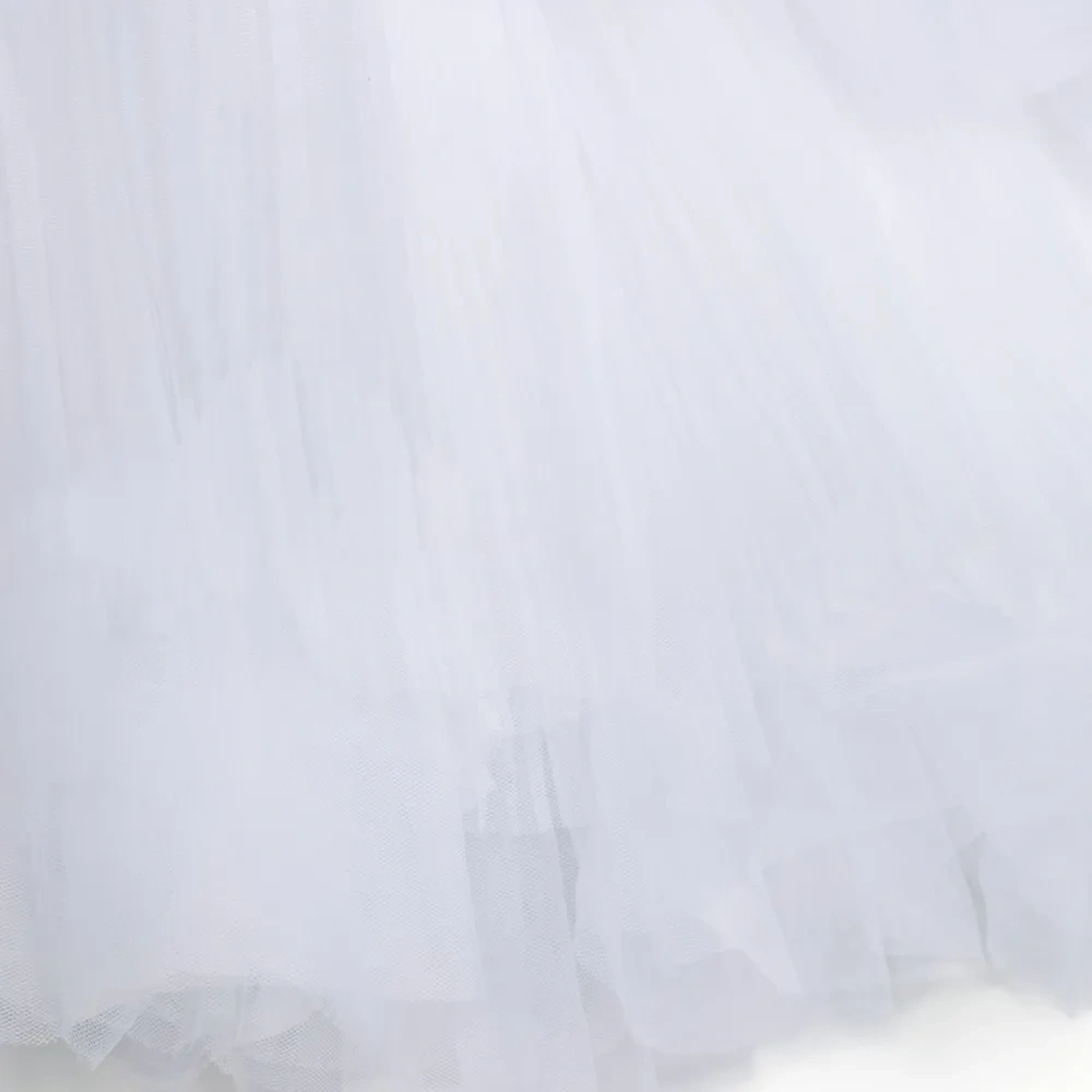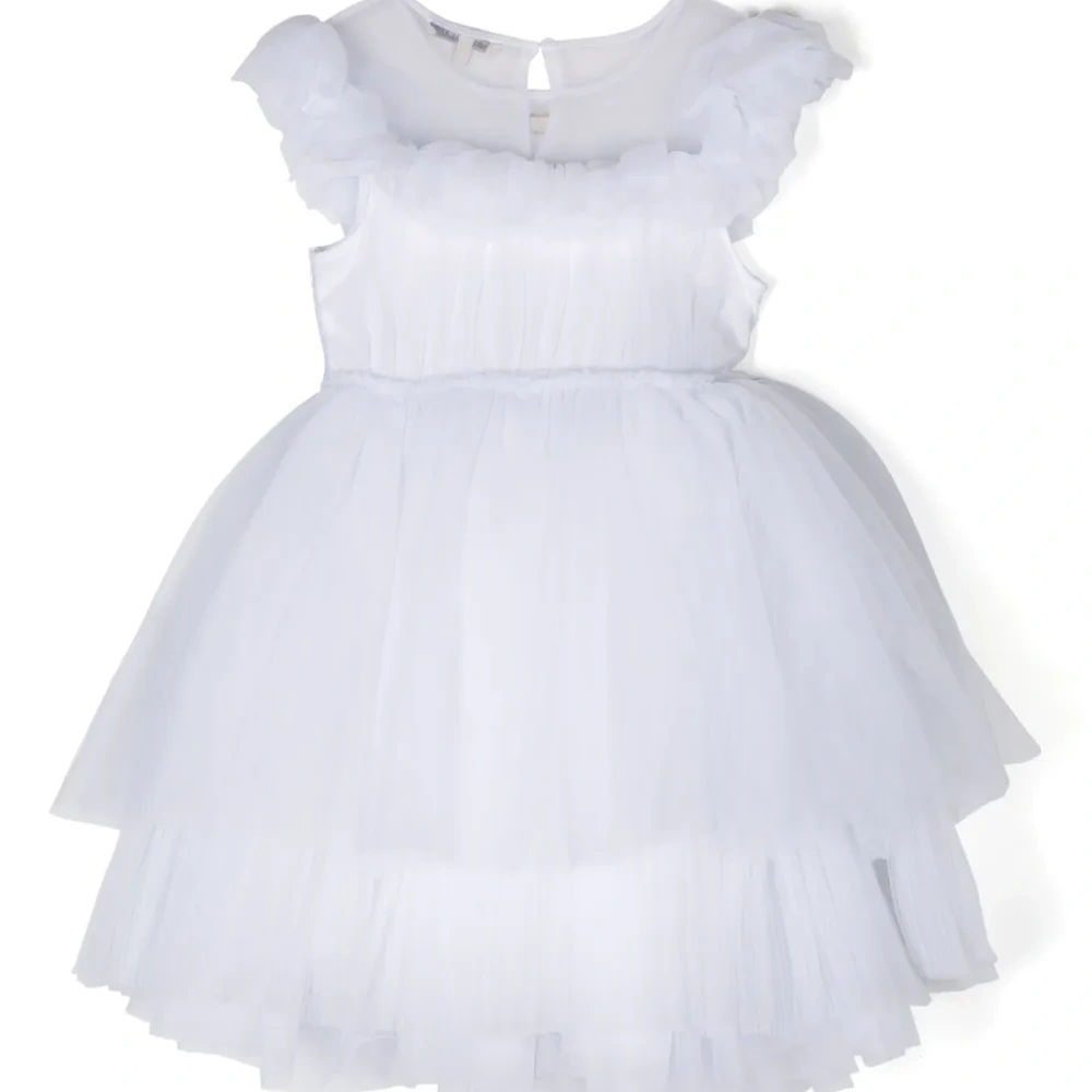 Белый, дизайн со сборками, вставки с оборками, золотистый металлический логотип, круглый вырез, застежка на пуговицы сзади, без рукавов и ярусная юбка.