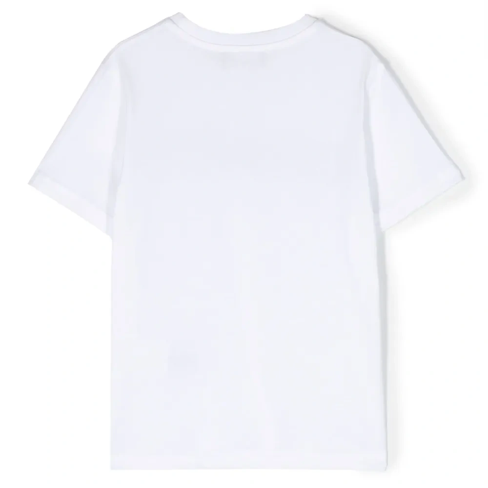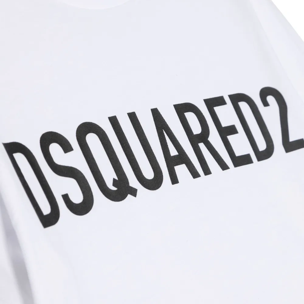 Белый, хлопок, логотип спереди, круглый вырез, короткие рукава и прямой подол.