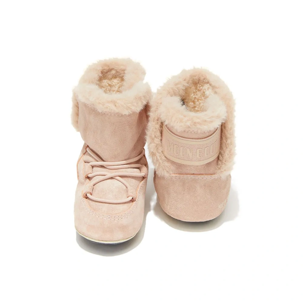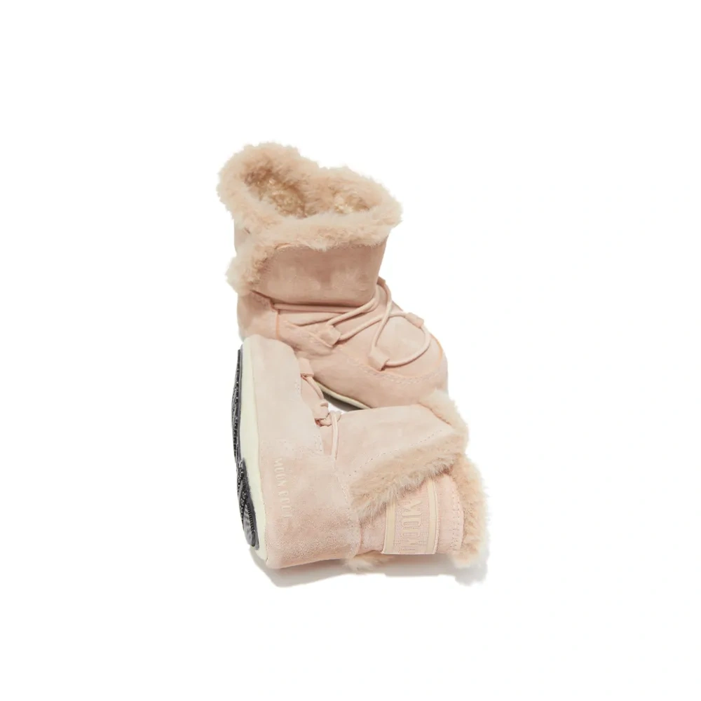 Светло-розовый, замша, отделка лентой с логотипом, подкладка из искусственного меха, шнуровка спереди, закругленный носок, высота по щиколотку и плоская резиновая подошва.