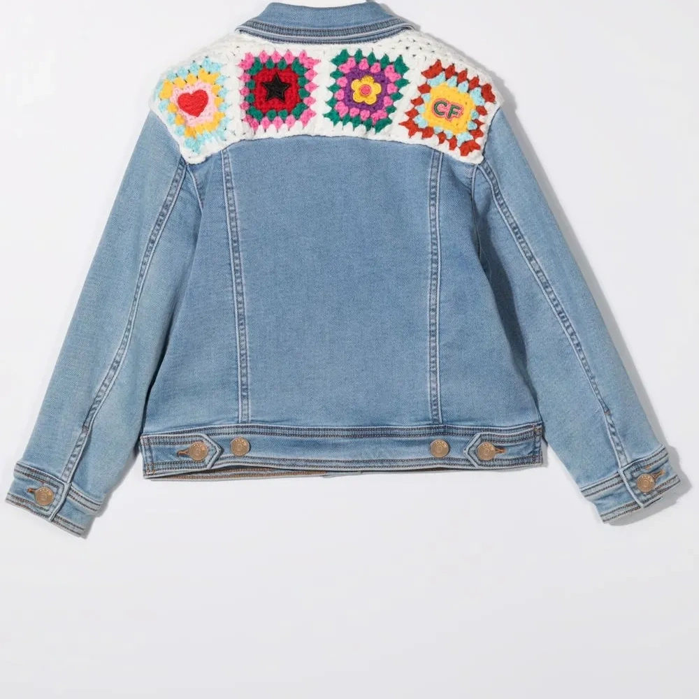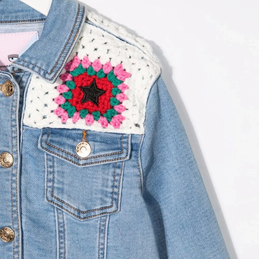 Вставки в технике кроше, застежка на пуговицах спереди, два накладных кармана на груди, классический воротник, декоративные швы и прямой подол.