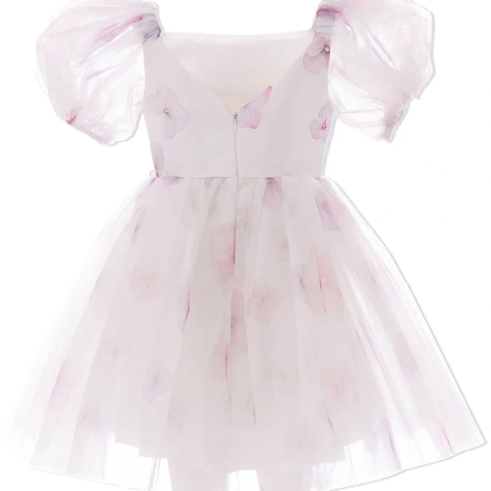 Белый, малиновый, сплошной цветочный принт, цветочная аппликация, квадратный вырез, V-образный вырез сзади, застежка на молнии сзади, короткие объемные рукава, прозрачные рукава , приталенный силуэт и прямой подол.