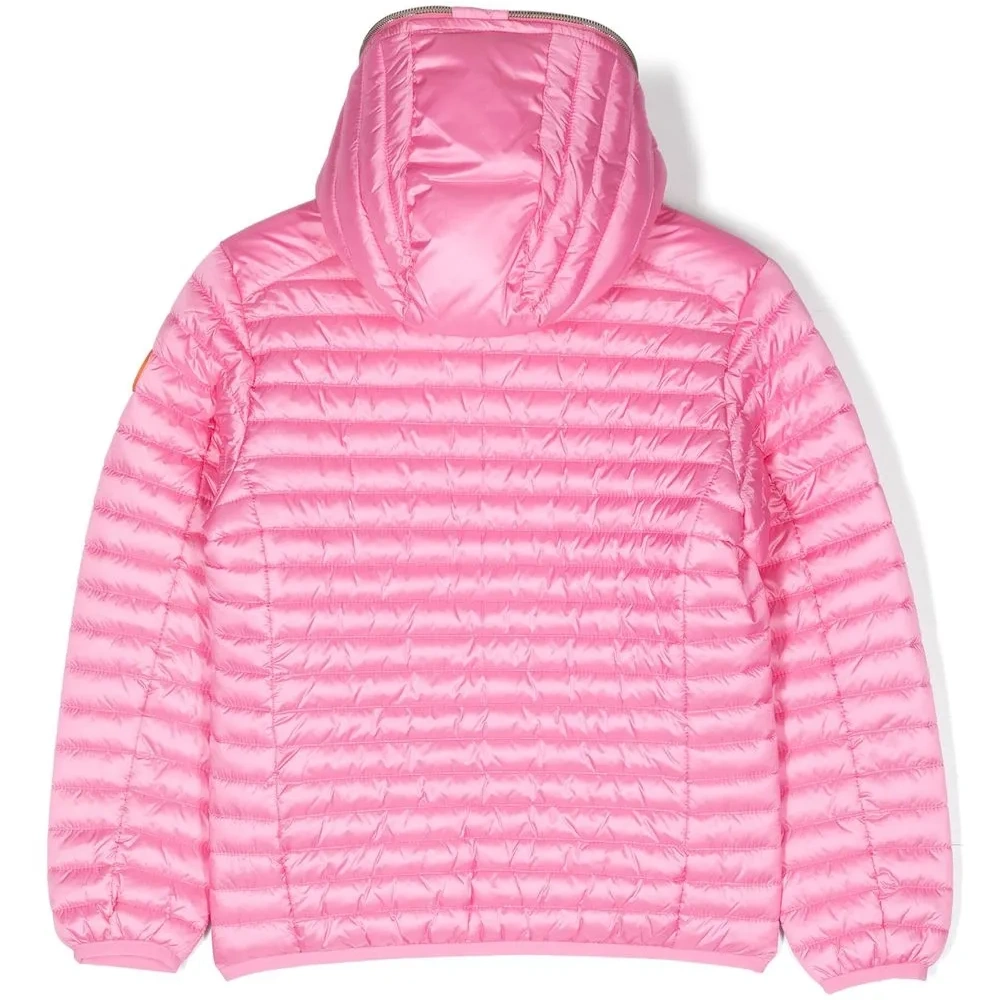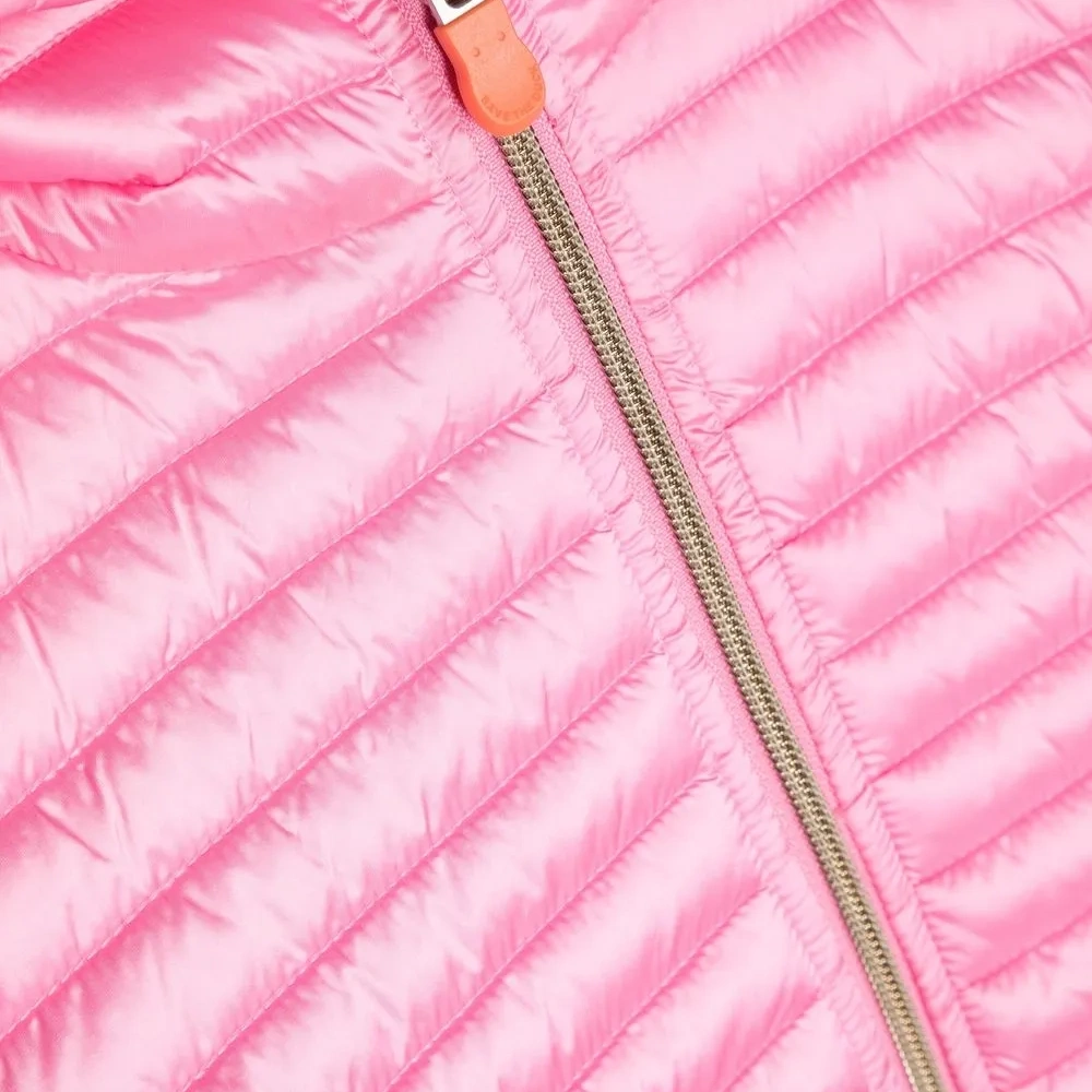 Розовый, дутый материал, классический капюшон, длинные рукава, застежка на молнии спереди, два кармана на молнии по бокам, эластичные манжеты, эластичный подол и нашивка с логотипом на рукаве.