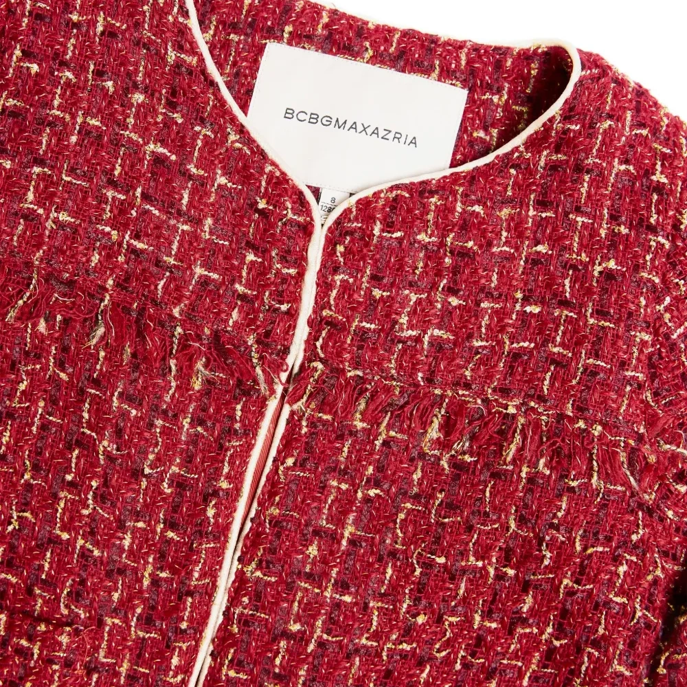красный твид, фактурный, без воротника, скрытая застежка, бахромчатый край, накладные карманы спереди, длинные рукава, укороченный низ