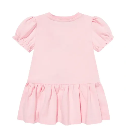 розовое платье с изображением мишки, круглым вырезом, короткими рукавами, юбкой со сборками, застежкой на кнопки сзади