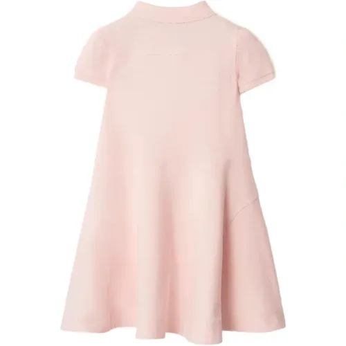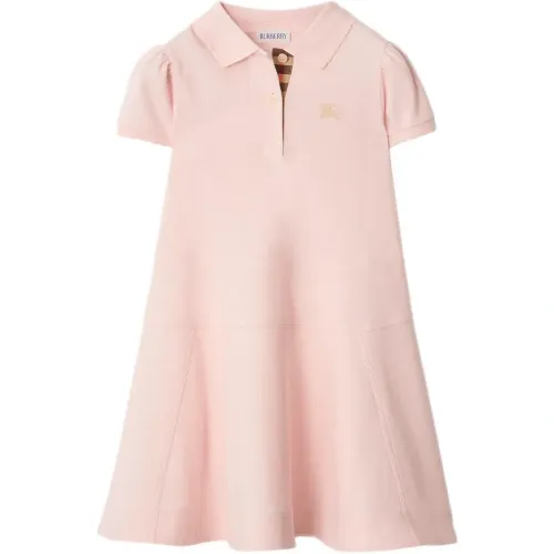 розовая юбка А-силуэта с короткими рукавами, отложным воротником-поло, застёжкой на пуговицы спереди и логотипом
