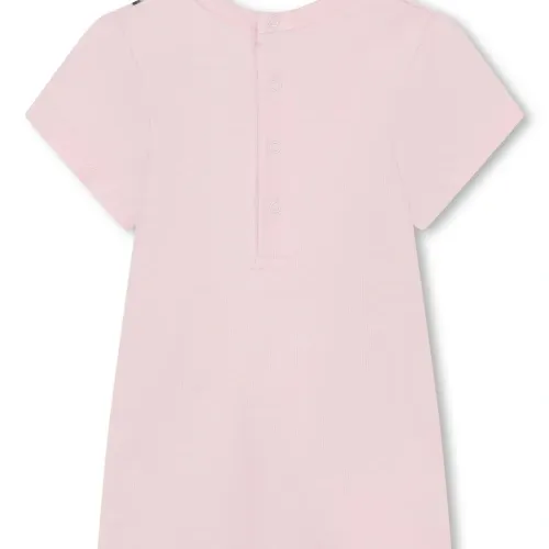 Пудрово-розовый, белый, черный, хлопок, круглый вырез, графичный принт спереди, застежка на кнопках сзади, короткие рукава и прямой подол.