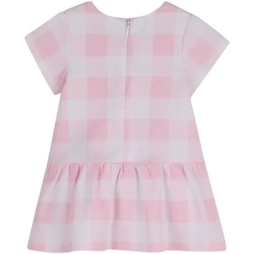 розовая футболка с клетчатым узором, цветочной аппликацией, короткими рукавами, круглым вырезом и оборчатым подолом