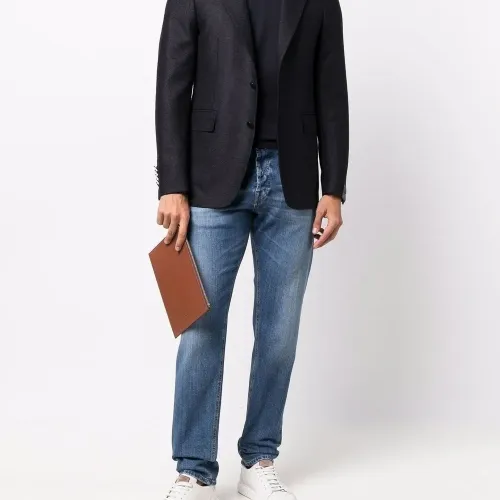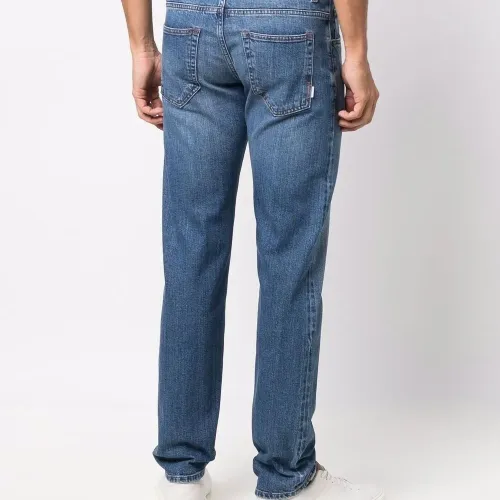 Декоративные складки, эффект потертости, нашивка с логотипом сзади, петли для ремня, классическая пятикарманная модель и прямой крой. Цвет: синий.