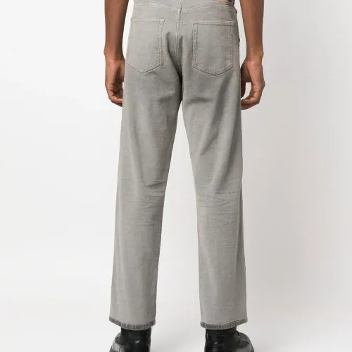 Темно-серый, эластичный хлопок, нашивка с логотипом сбоку, нашивка с логотипом сзади, петли для ремня, прямой крой и пять карманов.