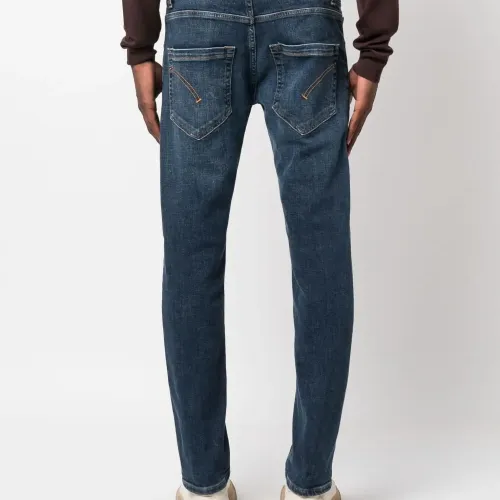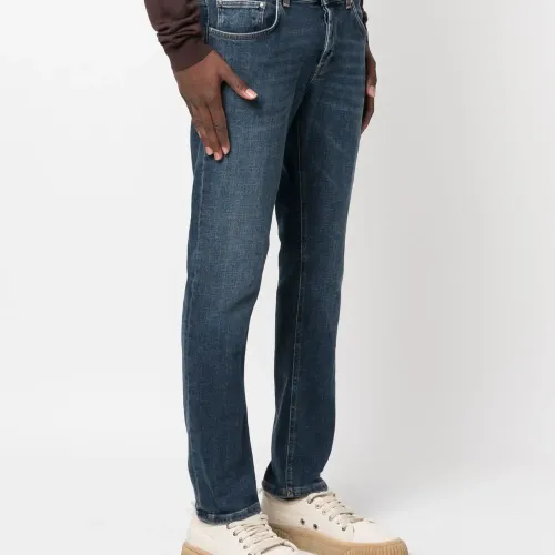 Синий, эластичный хлопок, деним, принт с логотипом сзади, декоративные складки на бедрах, контрастная строчка, низкая посадка, прямой крой, узкий крой и пять карманов.