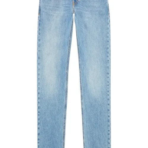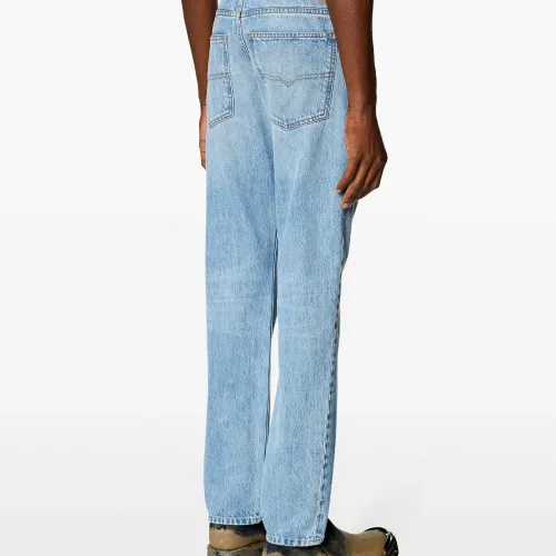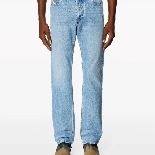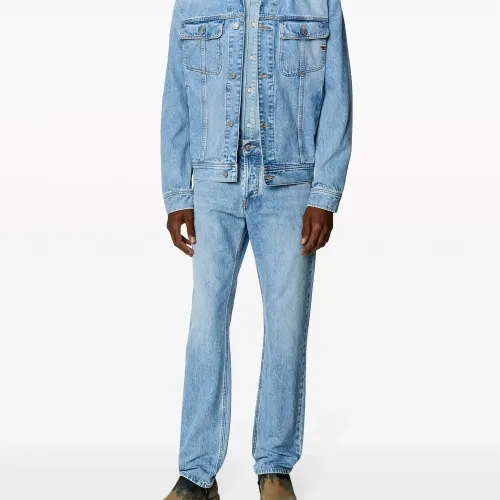Обработанный деним, декоративные складки, контрастная строчка, логотип-аппликация, потайная застежка на молнии и пуговицах, прямой крой, пять карманов и прямой подол.
