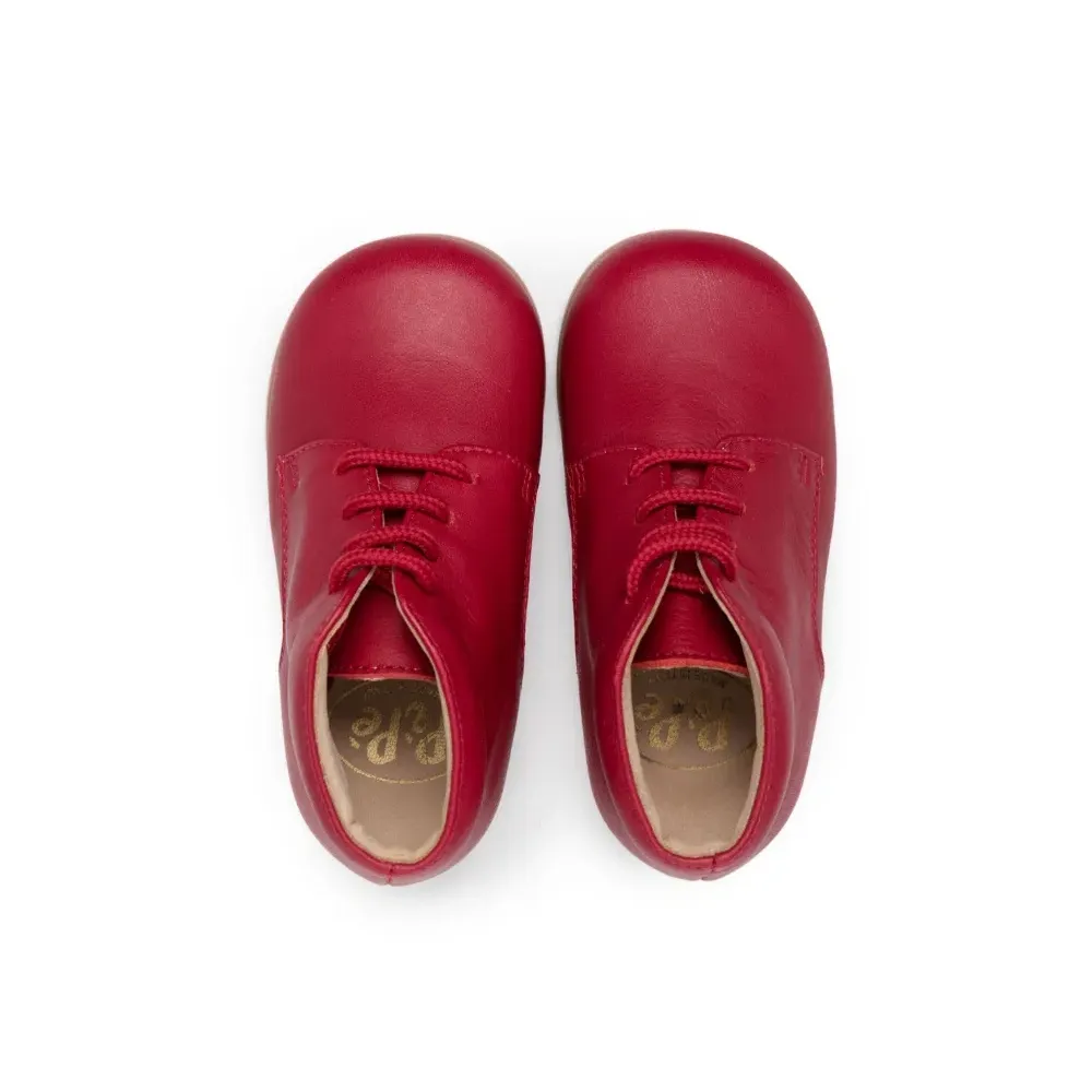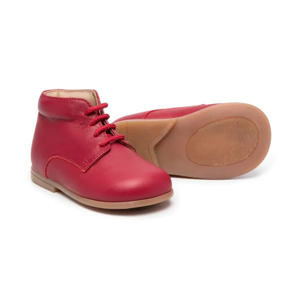 Красный, телячья кожа, высота по щиколотку, шнуровка спереди, закругленный носок и плоская резиновая подошва.