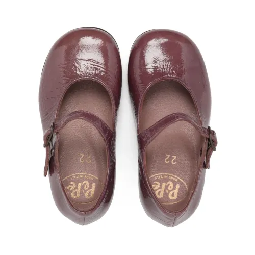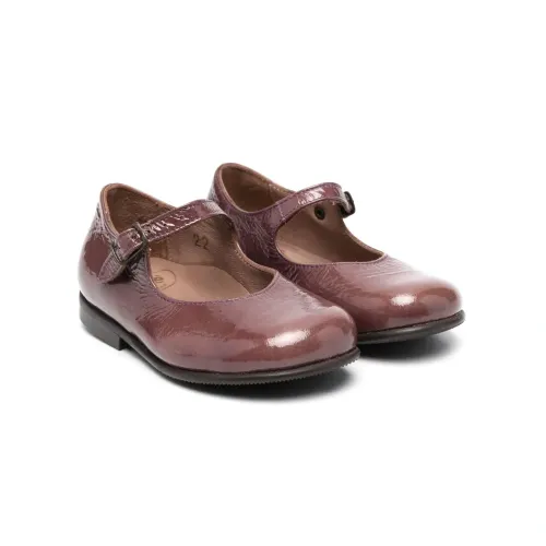 Шоколадный, телячья кожа, лакированная отделка, застежка на пряжке, закругленный носок и плоская резиновая подошва.