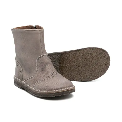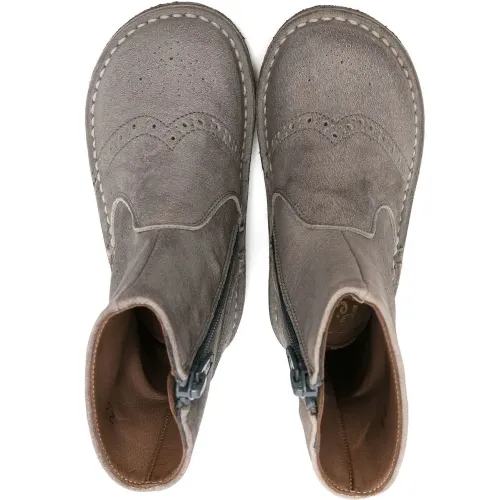 Серый, телячья кожа, перфорация, закругленный носок, застежки на молнии сбоку, высота по щиколотку и резиновая подошва.