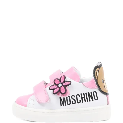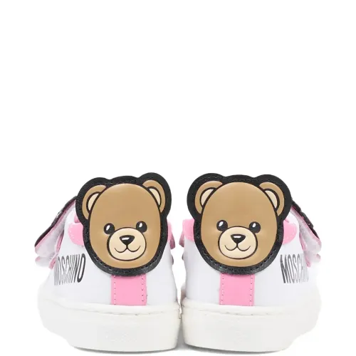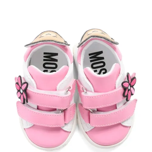 белые и розовые детали в виде цветов, мотив с изображением медвежонка, застежка на липучке, круглый мыс, плоская подошва