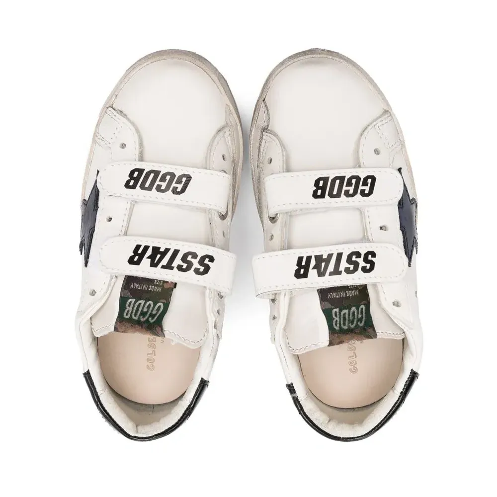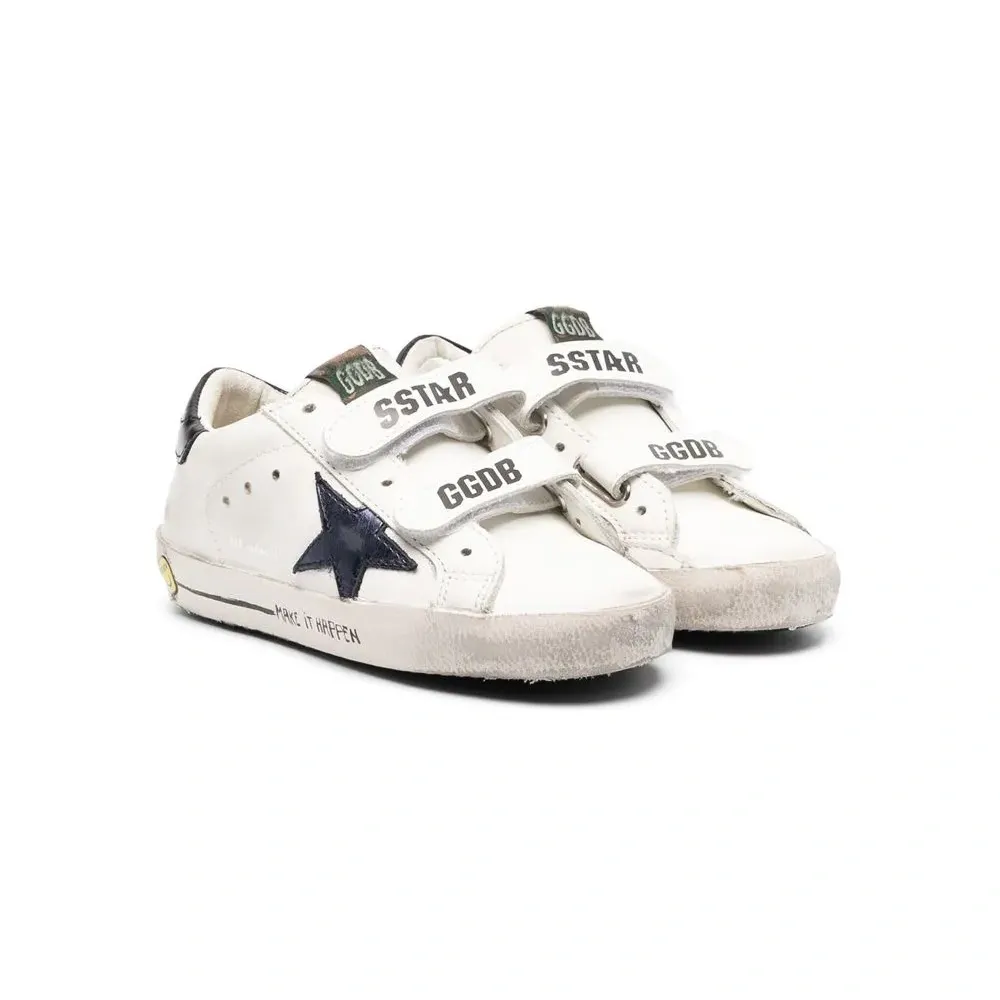 Белый, темно-синий, телячья кожа, нашивка в форме звезды сбоку, нашивка с логотипом на язычке, закругленный носок, перфорированный носок, застежка на липучке спереди, контрастный задник с логотипом и плоская подошва.