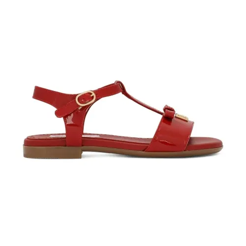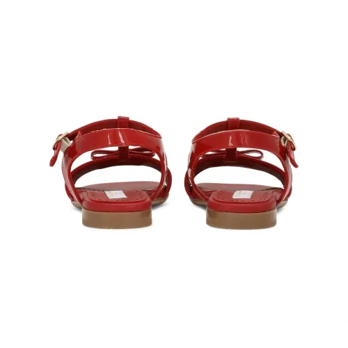 Красный, телячья кожа, лакированная отделка, золотистый металлический логотип, бант, Т-образный ремешок, ремешок на щиколотке с пряжкой, открытый носок, кожаная стелька с логотипом и плоская резиновая подошва.