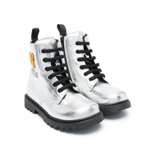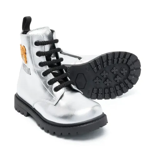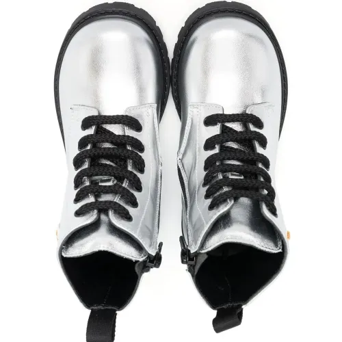 Серебро, телячья кожа, эффект металлик, закругленный носок, шнуровка спереди, высота по щиколотку, рифленая резиновая подошва и низкий каблук.